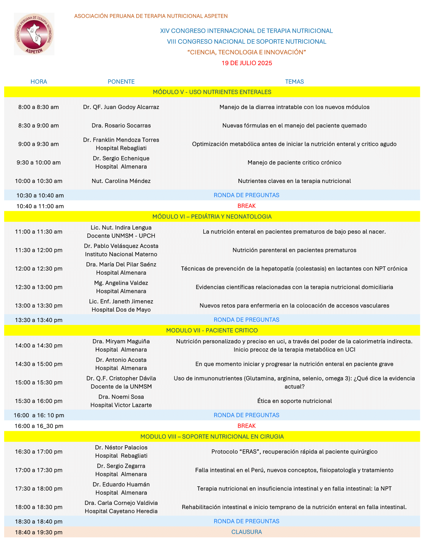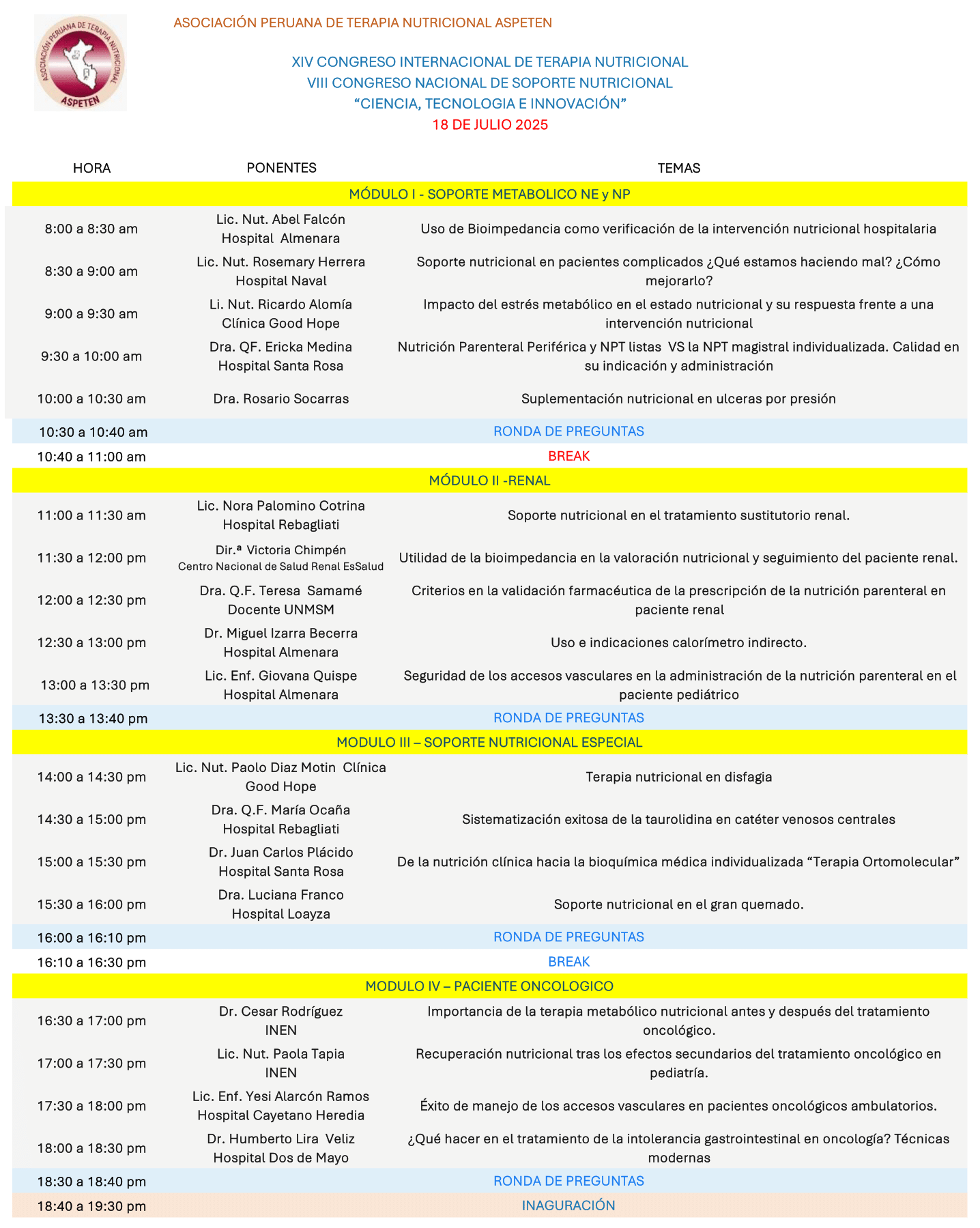 Estimadas colegas y profesionales de la salud: Es un honor invitarlos a nuestro próximo Congreso de Terapia y Soporte Nutricional, un espacio donde la ciencia, la tecnología y la innovación convergen para transformar la práctica clínica y mejorar la calidad de vida de nuestros pacientes. Este encuentro reunirá a expertos nacionales e internacionales en un ambiente de aprendizaje, intercambio y actualización, impulsando juntos el futuro de la nutrición médica. Los esperamos para compartir conocimientos, experiencias y una visión renovada de la atención nutricional basada en la evidencia y el avance científico. ¡Bienvenidos!